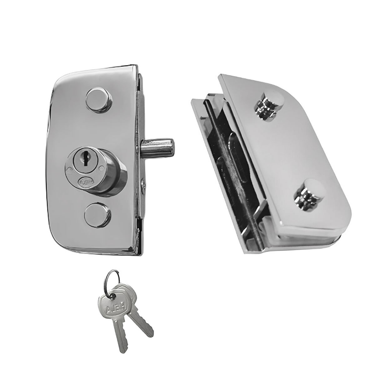 Kit fechadura 1520 + contra fechadura com aparador 1531 para porta pivotante de vidro temperado `blindex` com fechamento vidro/vidro. Ferragem ideal recomendada para vidro temperado com espessura de 6 a 10 milímetros.