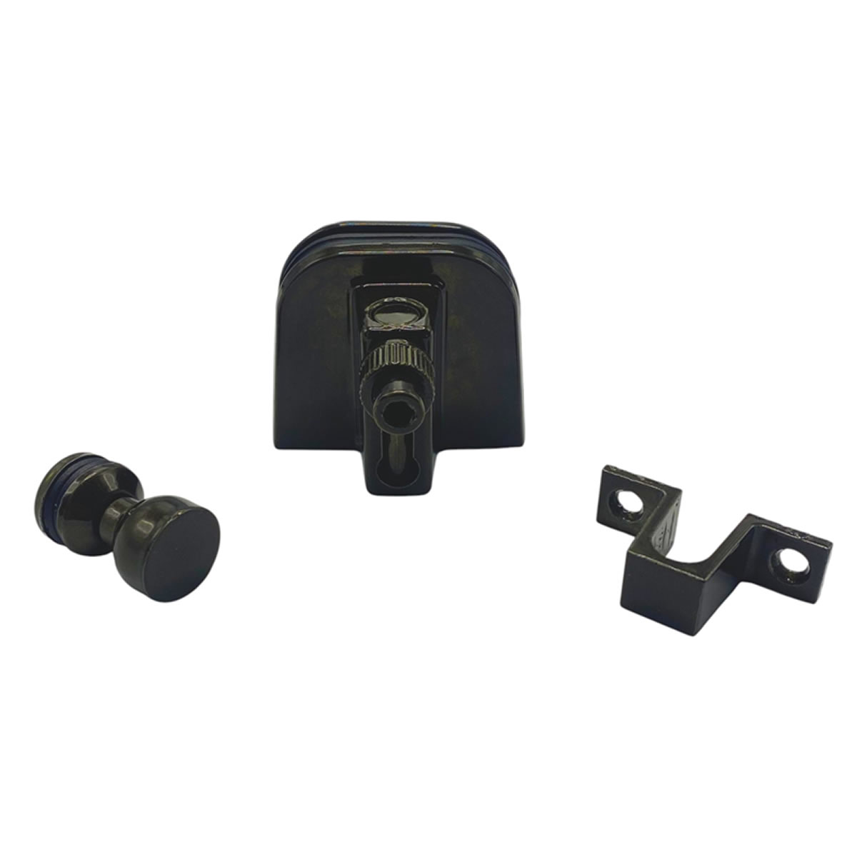 O kit inclui um trinco, um puxador e um contra trinco, todos feitos de zamak com acabamento bronze. Eles são compatíveis com vidros temperados de 6 a 10 milímetros.