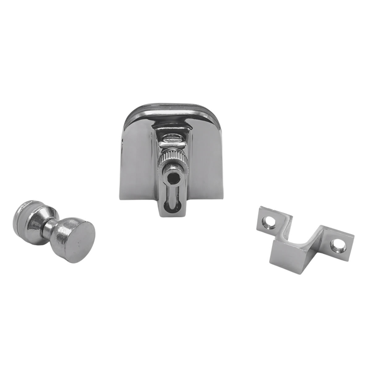 O kit inclui um trinco, um puxador e um contra trinco, todos feitos de zamak com acabamento cromado. Eles são compatíveis com vidros temperados de 6 a 10 milímetros.